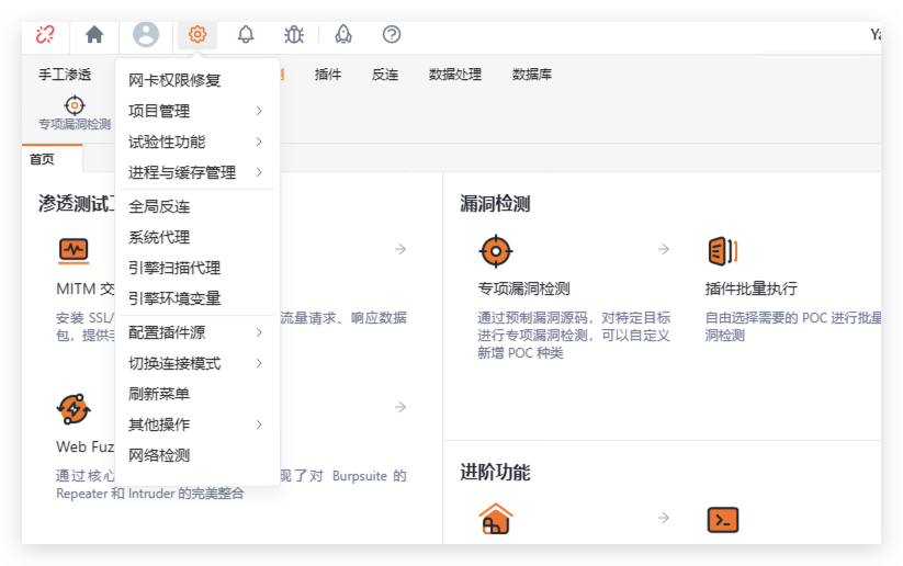 在 Yakit 首页的右上角,我们可以看到,有四个功能。