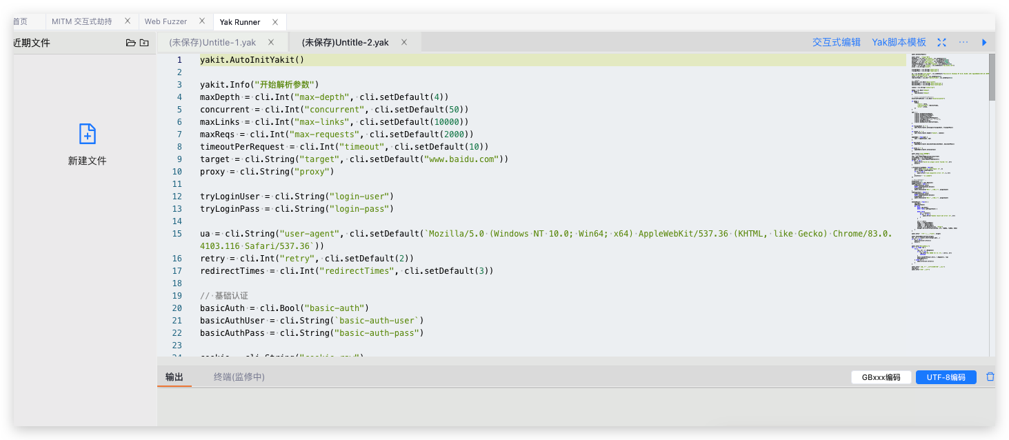- Yak Runner:Yak Runner为Yak代码的编辑器,在这个页面可以创建文件,运行代码等。点击“Yak脚本模板”选择模板代码进行编辑。