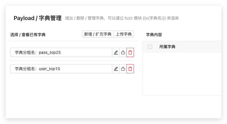 - Payload:可新建字典或者扩充已有字典。选择已有字典,输入字典内容的话,则是在原有的字典新增内容。如果新的字典名,则是创建新的字典。添加/新建时会进行去重操作。