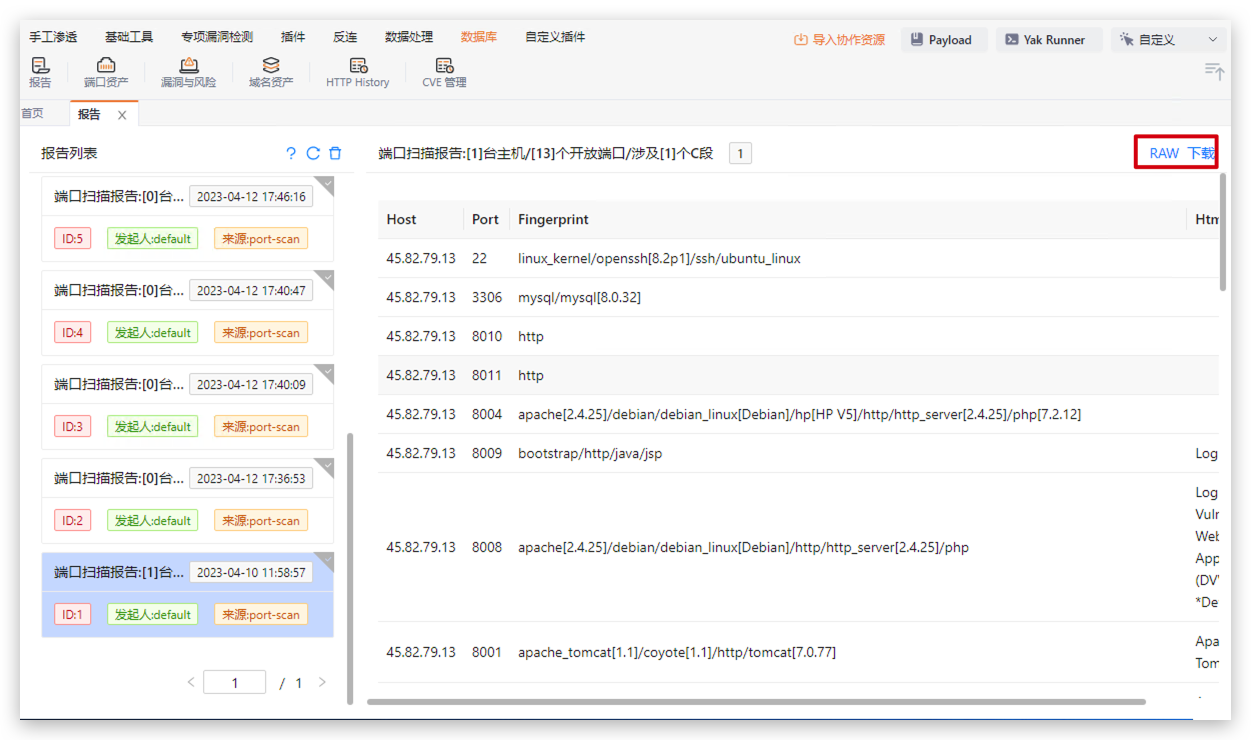 端口探测和指纹扫描功能模块结果统计在数据库中,会形成一个简易的扫描报告。