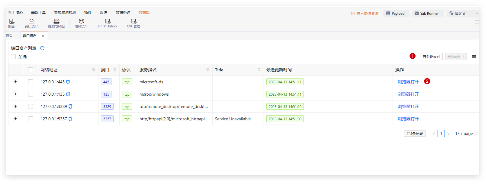 端口探测和指纹扫描功能模块扫描详情会保存在数据库端口资产中,并且资产支持搜索功能,可以发送到漏洞检测模块检测漏洞,并支持导出保存为Excel。其他资产数据也同端口资产,不一一赘述。