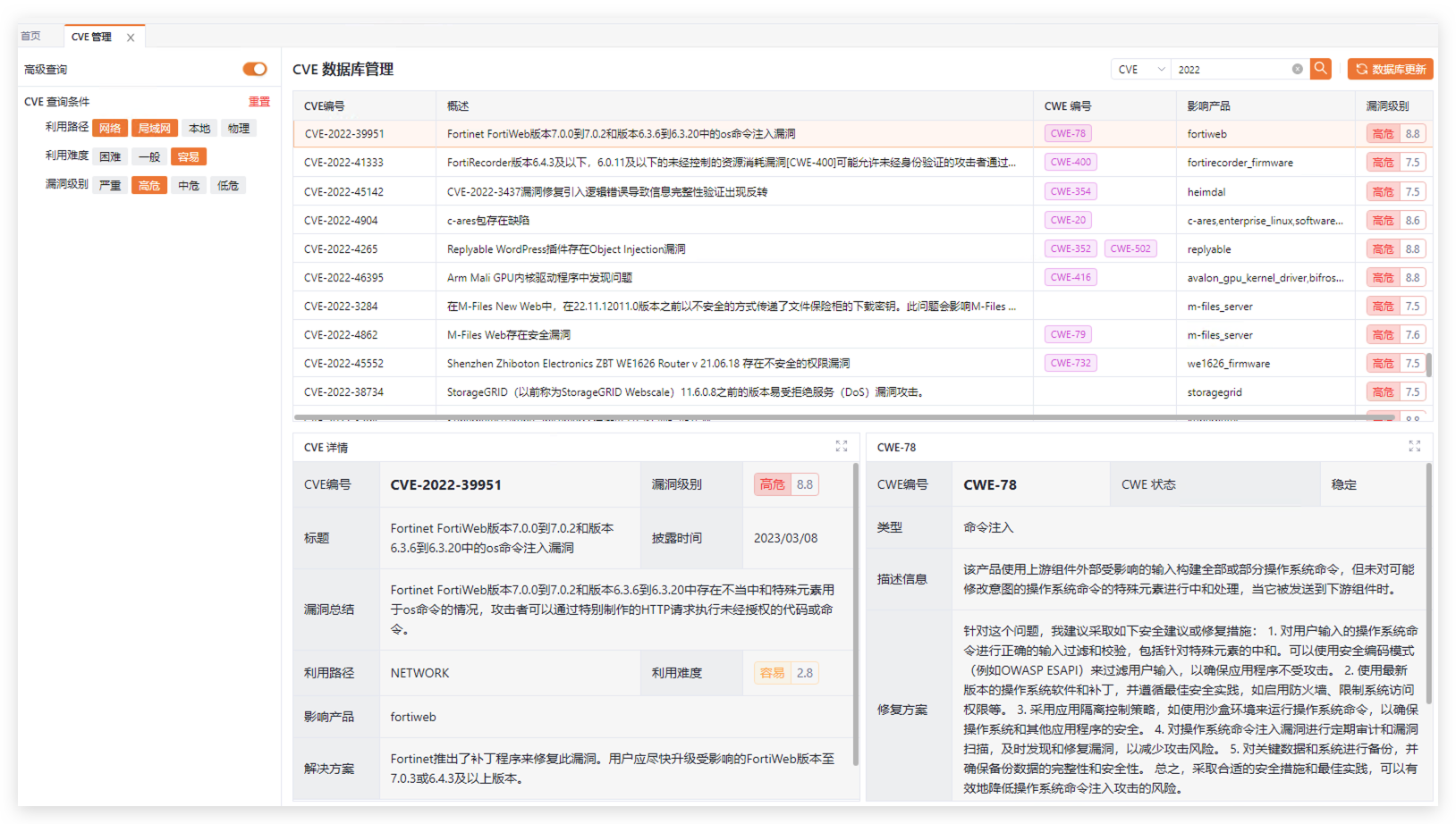 左边打开高级查询开关,可以根据条件进行筛选,点击对应的漏洞,下方会展示CVE详情和CWE详情,右上角可以根据编号进行搜索。