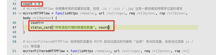 我们可以做一个简单的计数器,在 MITM 的 Hook 函数内实现统计方法,每一个数据包都会被记数,从而实现一个指标来记录流经我们劫持平台的数据包到底有多少。