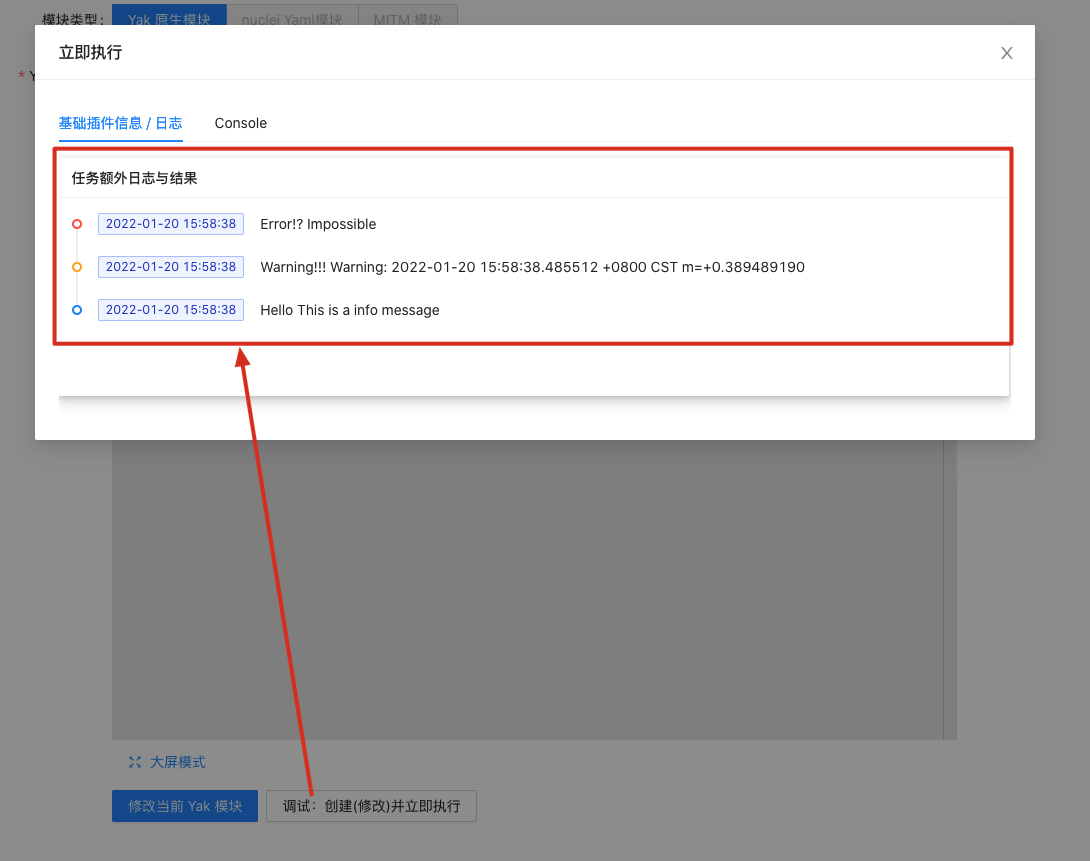 yakit.AutoInitYakit()yakit.Info("Hello This is a info message")yakit.Warn("Warning!!! Warning: %v", now())yakit.Error("Error!? Impossible")当我们把这段代码在插件中执行时,得到如下内容