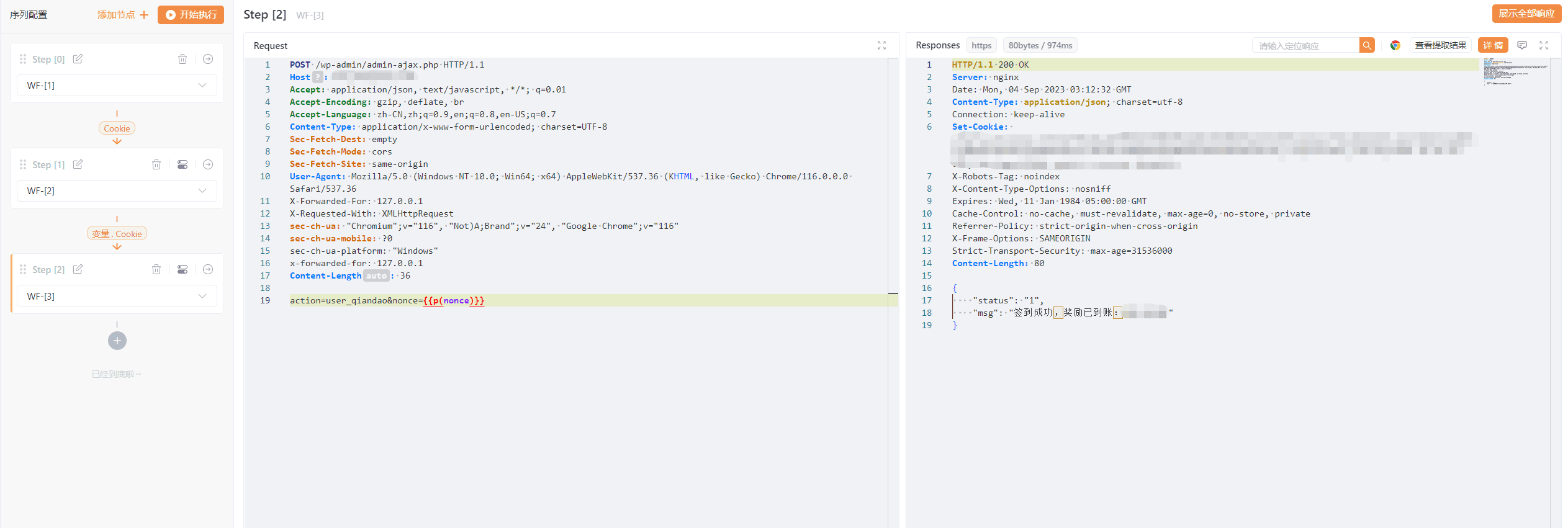 - 使用获取到的nonce值(继承变量和cookie),其中第三个请求使用到第二个请求的变量: