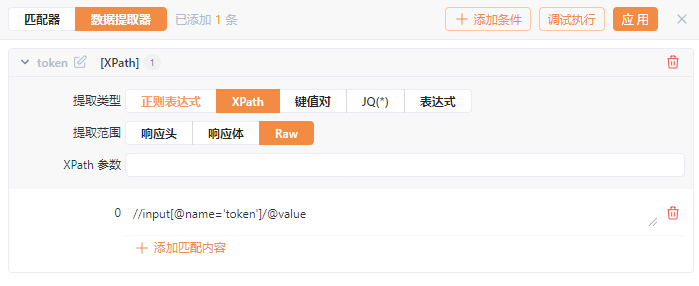 要完成爆破功能,我们需要先使用前文提到的提取器提取token,我们添加一个变量名为 token 的 Xpath 提取器,使用 //input[@name='token']/@value进行匹配: