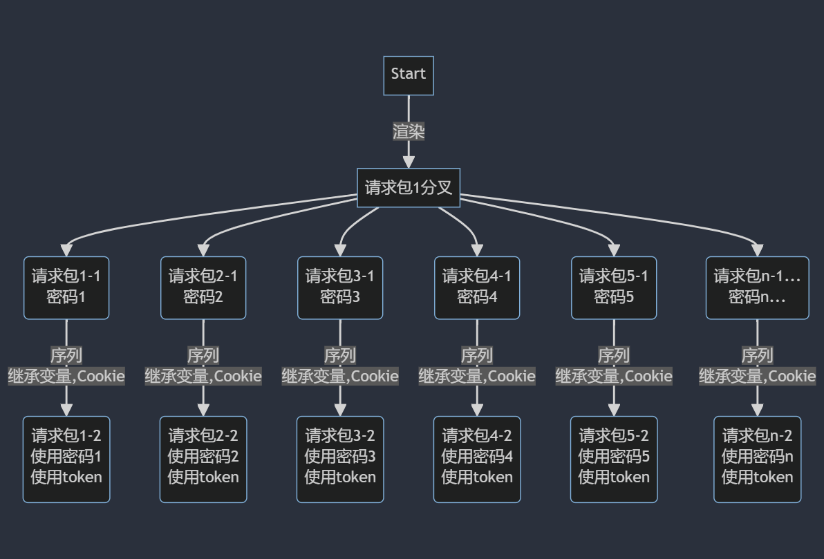 由于第二个登录数据包需要使用到第一个请求中的 token,即每次登录前要获取一次 token,因此我们需要从第一个请求中进行分叉,这点至关重要,如图所示: