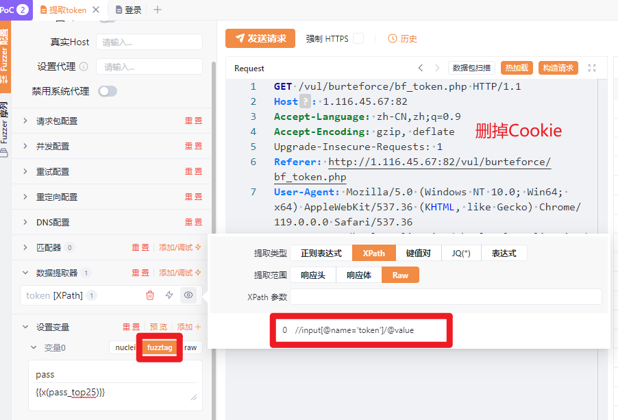 此外,为了进行爆破并且每次请求的 token 互不干扰,所以我们在第一个获取数据的请求包中删除了 Cookie,因为一般情况下 token 是和 Cookie 绑定的: