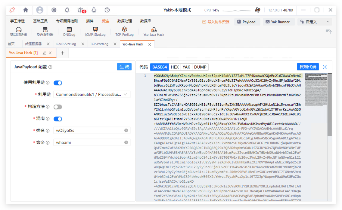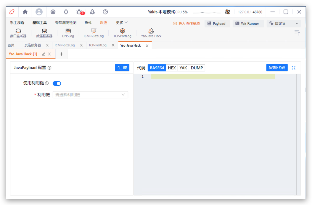 所以Yakit提供了两个特别好用的功能一个是前文提到的反连服务器,一个是Yso-Java Hack。无需Java环境,仅需一个Yakit。