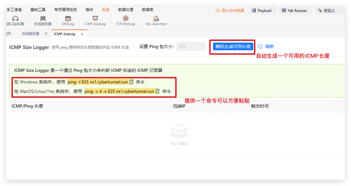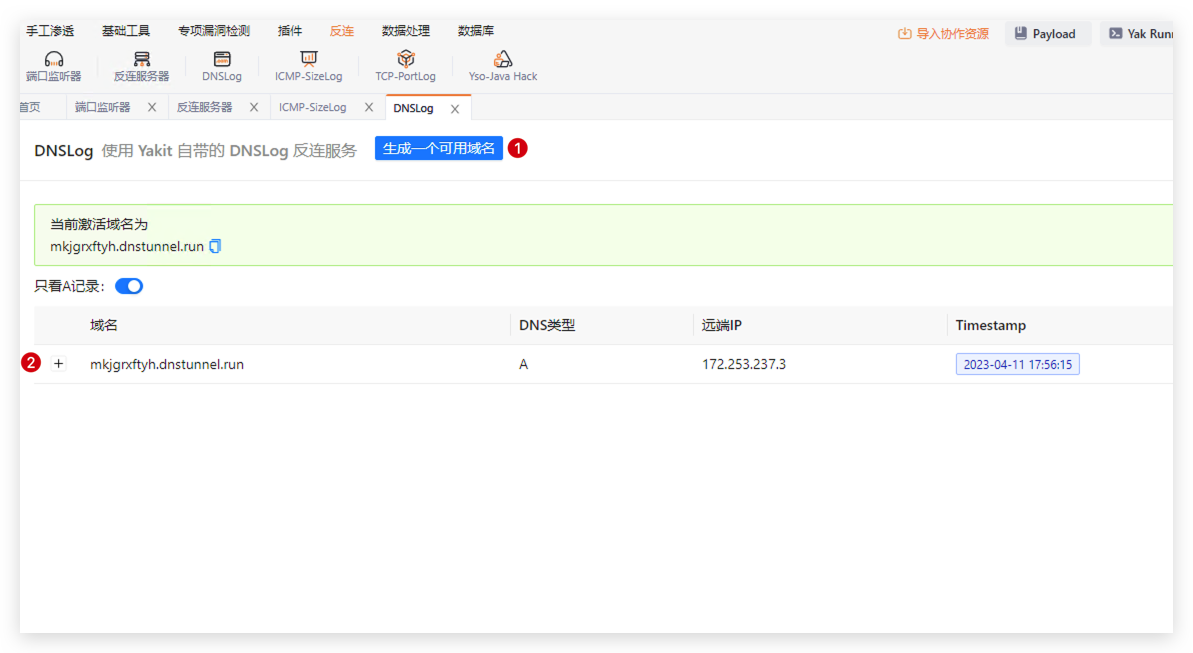 Yakit 提供了一个公共 DNSLog 服务,在DNSlog页面点击 生成一个可用域名 就可以获得一个可用于 DNSLog 检测的域名,域名的解析记录会在下方展示