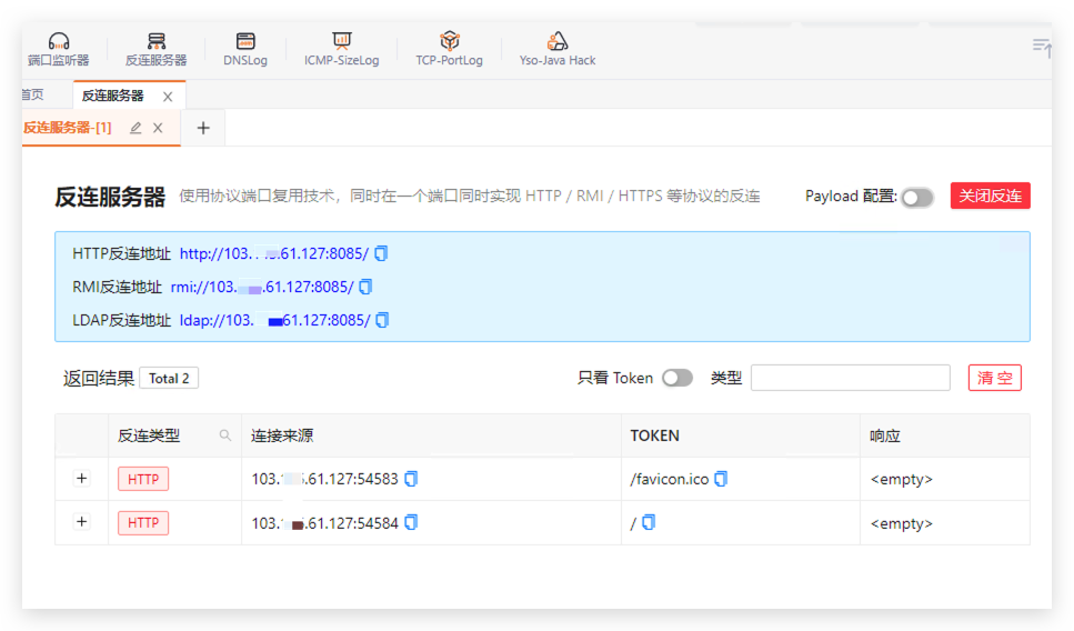 如图所示关闭公网穿透服务则在本地启动反连服务器,可以用于本地靶场测试或内网平台的漏洞检测