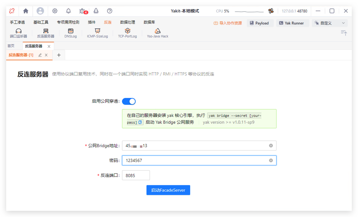 启动公网穿透,填写 Bridge 信息,连接启动,就可以支持公网反连