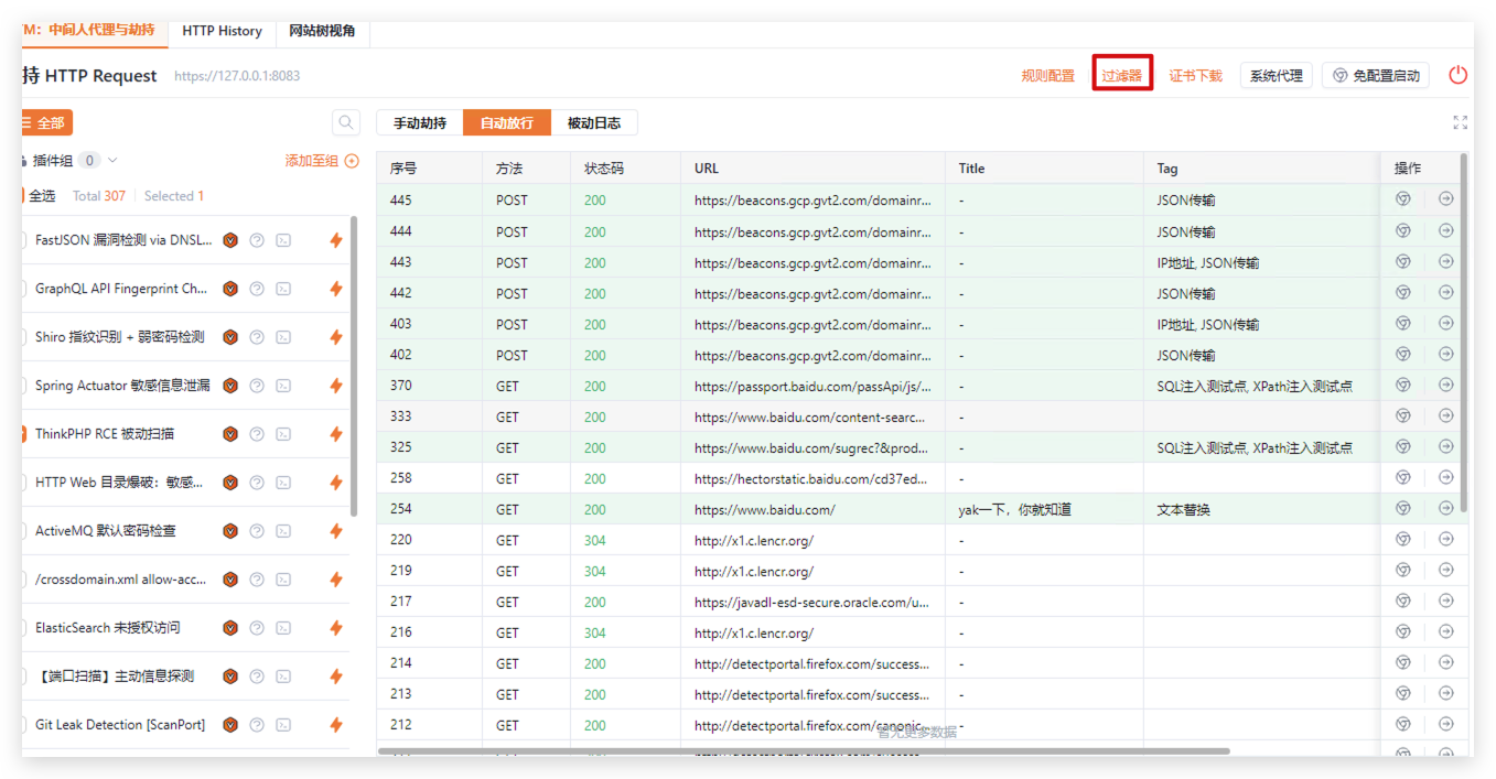 在专家模式 MITM 交互劫持时会产生大量的日志记录,为了更友好的管理,Yakit提供了筛选过滤器功能。针对某些数据包我们不需要看见,或者屏蔽某些污染数据就可以输入需要过滤的条件,劫持时则不会劫持符合条件的数据包。